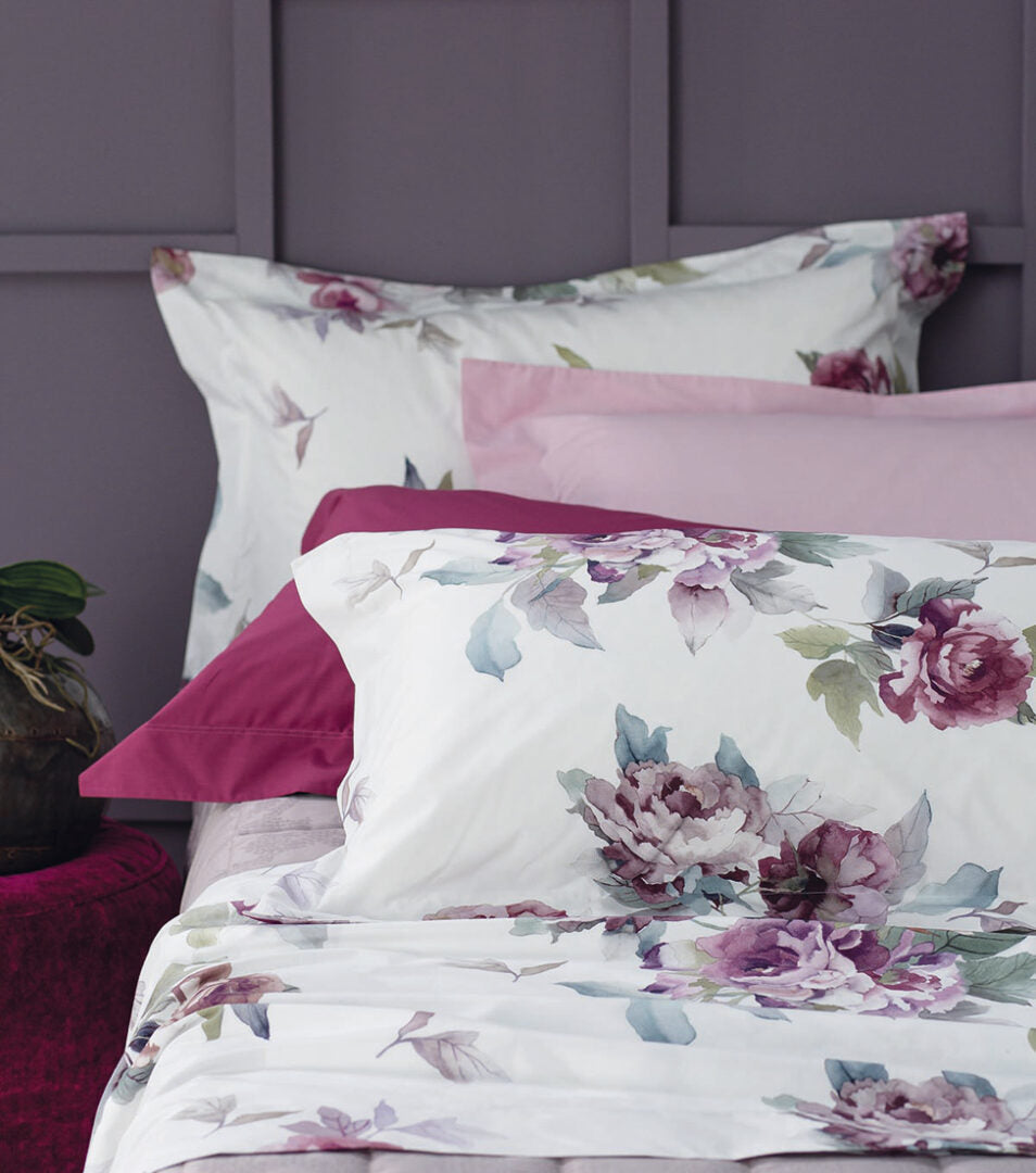 Completo lenzuola matrimoniale con classica stampa a fiori su fondo chiaro, lenzuolo sotto in percalle tinta unita. Una palette romantica e un disegno floreale, uniti all’effetto delicato dell’acquerello, danno alla tua stanza un tocco ricercato e femminile!