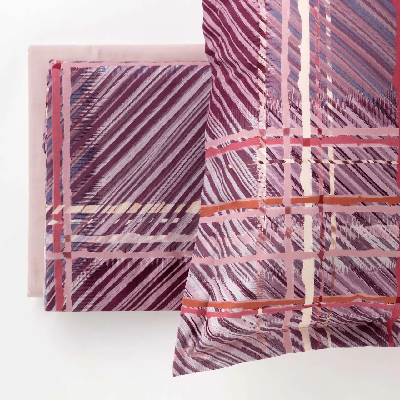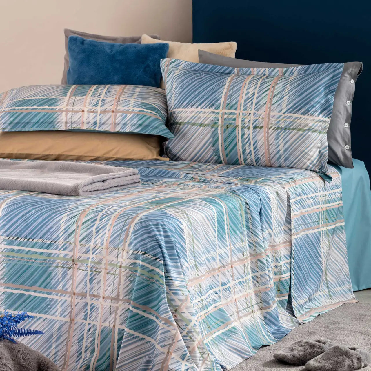 Il completo lenzuolo copriletto Yuta fonde estetica contemporanea e comfort naturale, grazie a una stampa digitale ad alta definizione su percalle 100% cotone. Il disegno tartan, composto da linee leggere e intrecci dinamici, si sviluppa sulla balza del lenzuolo e sul fronte delle federe con effetto copriletto, conferendo al letto un aspetto elegante e ordinato anche quando non è utilizzato.