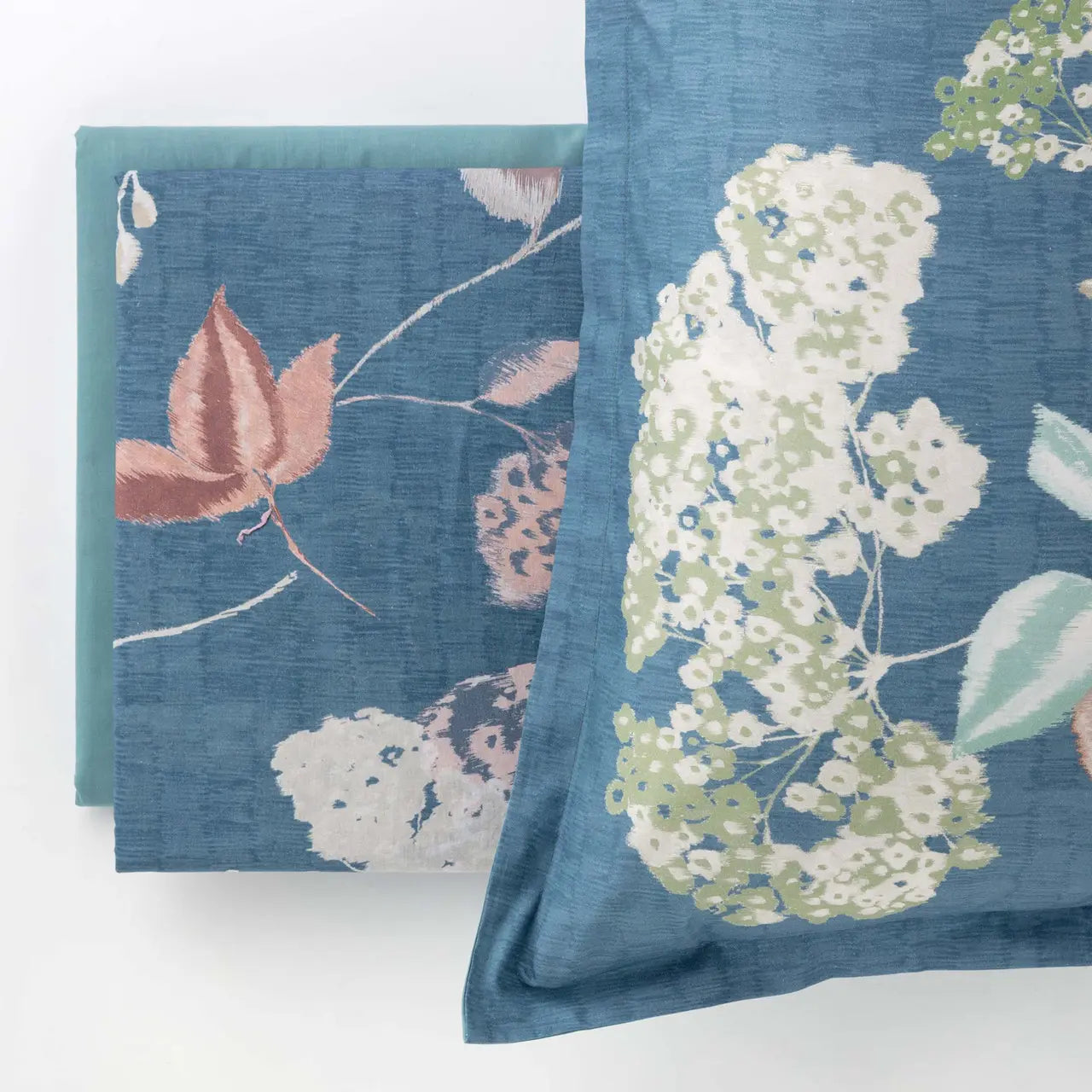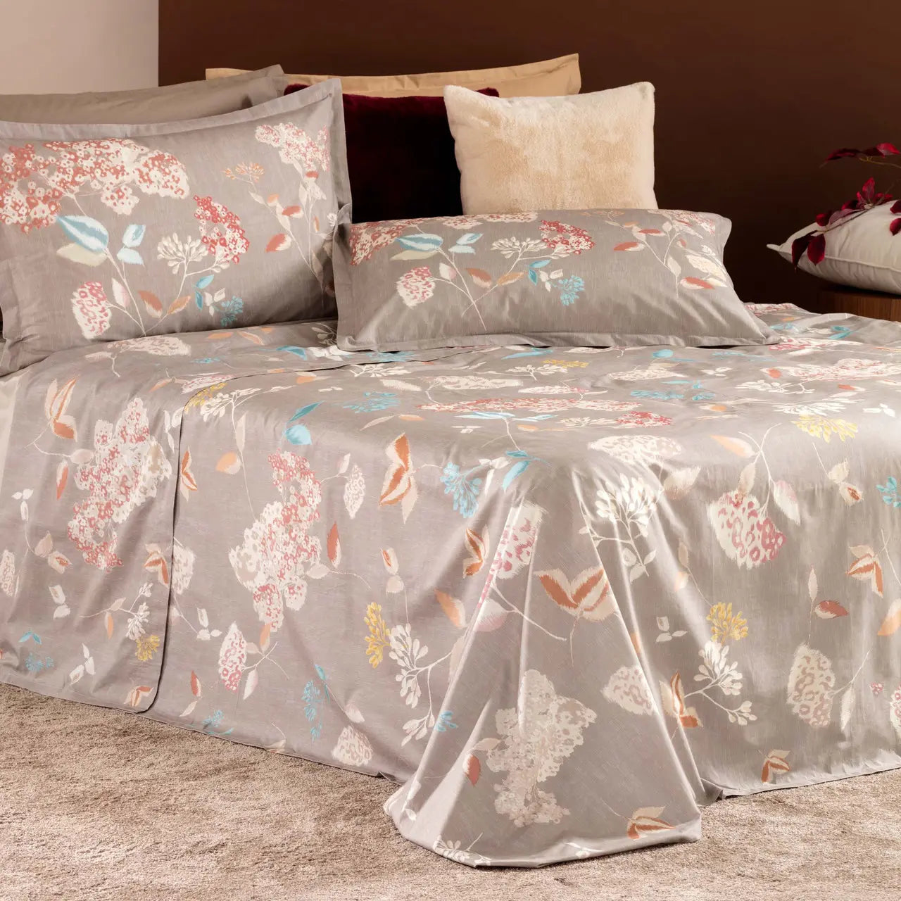 Il completo è disponibile solo nella versione matrimoniale e in due varianti cromatiche: Tortora, una tonalità calda e avvolgente perfetta per ambienti sofisticati, e Carta da Zucchero, un azzurro polveroso che dona freschezza e leggerezza alla stanza. Entrambe le opzioni valorizzano il disegno botanico e si adattano con naturalezza a diverse palette d’arredo.