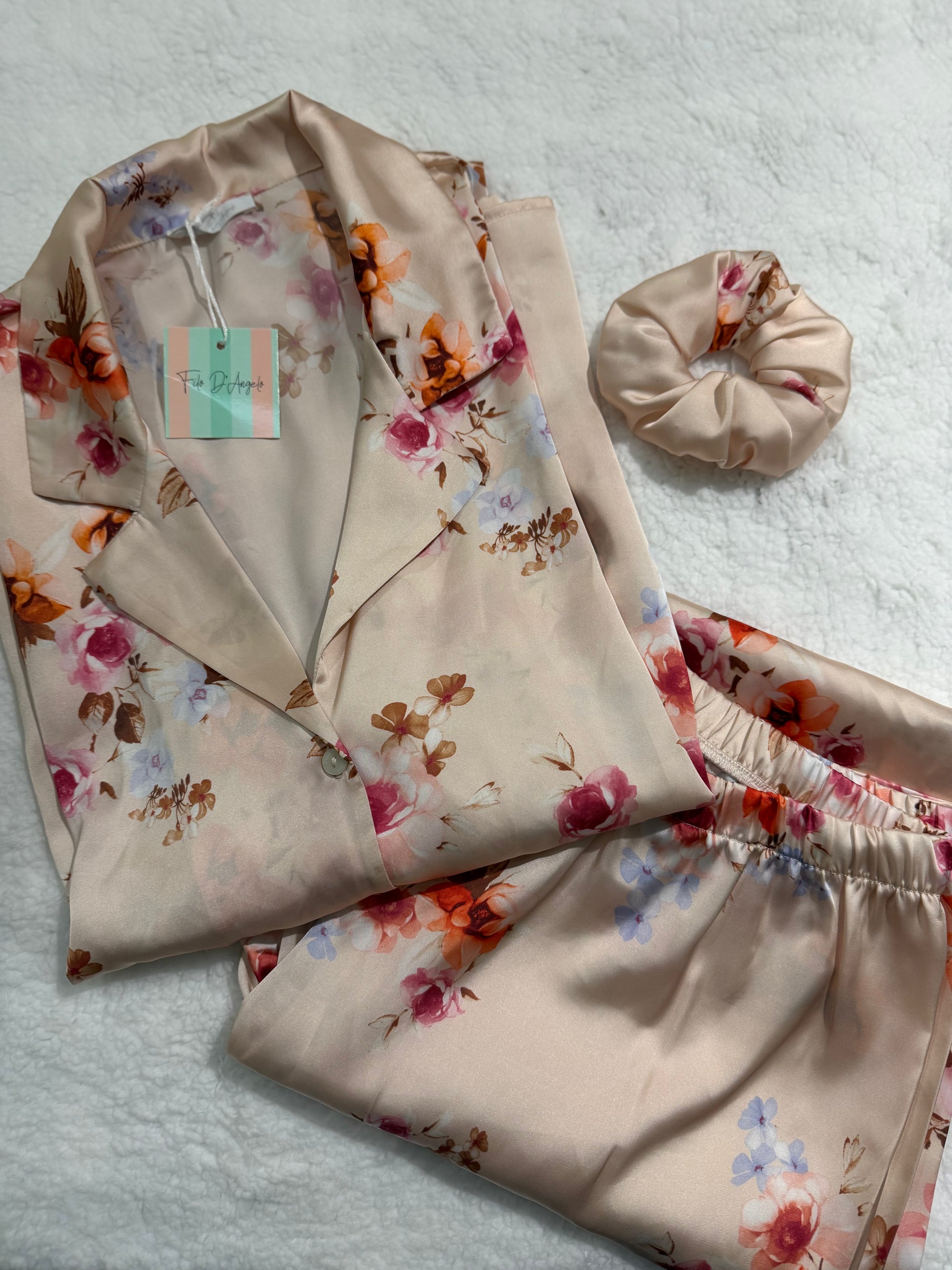 Pigiama in raso: camicia con colletto e chiusura anteriore con bottoni in madreperla; pantalone con elastico in vita