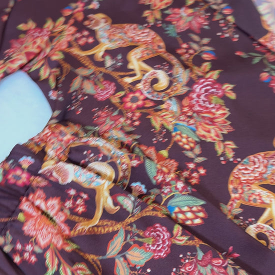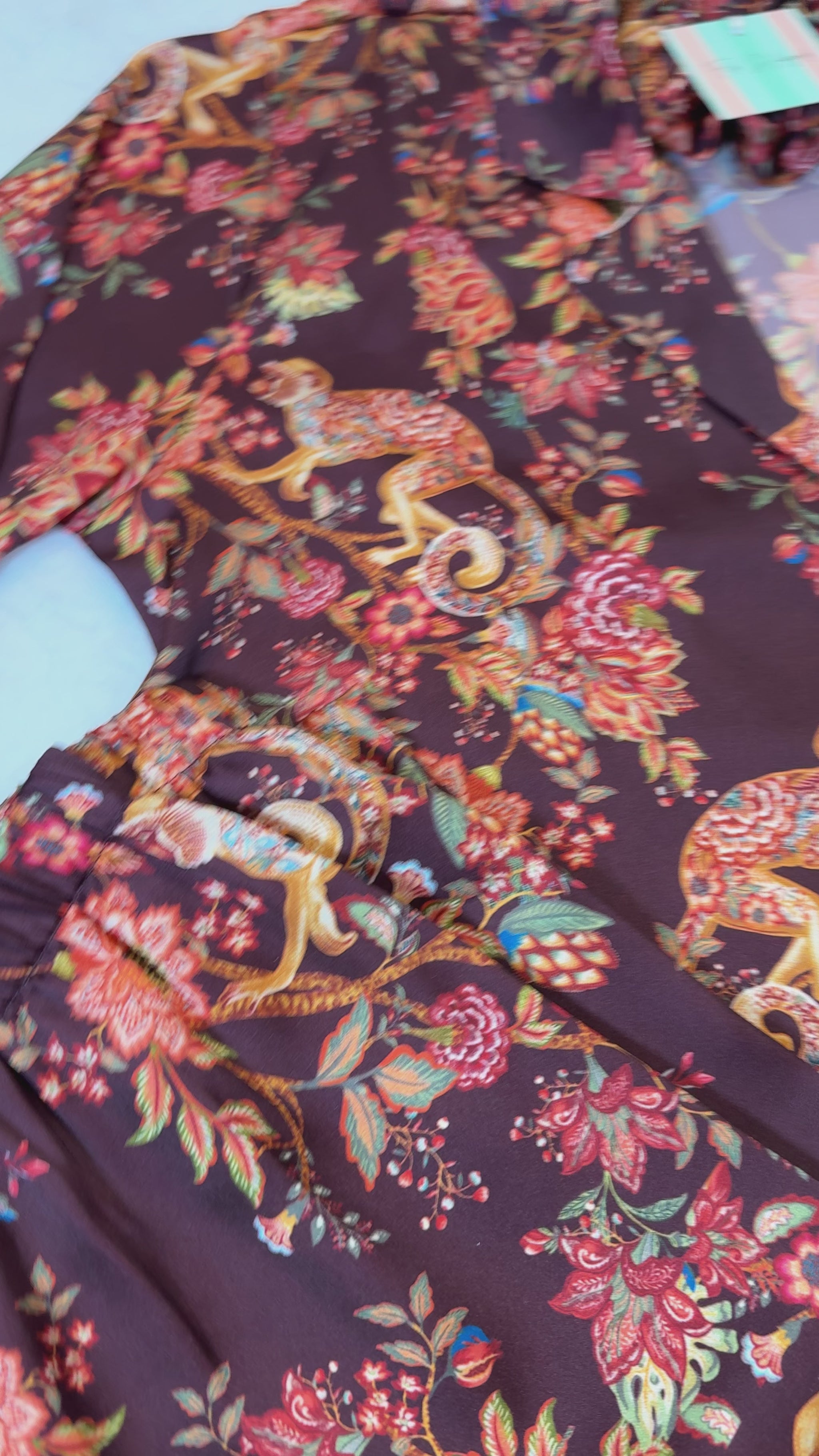 Pigiama in raso: camicia con colletto e chiusura anteriore con bottoni in madreperla; pantalone con elastico in vita