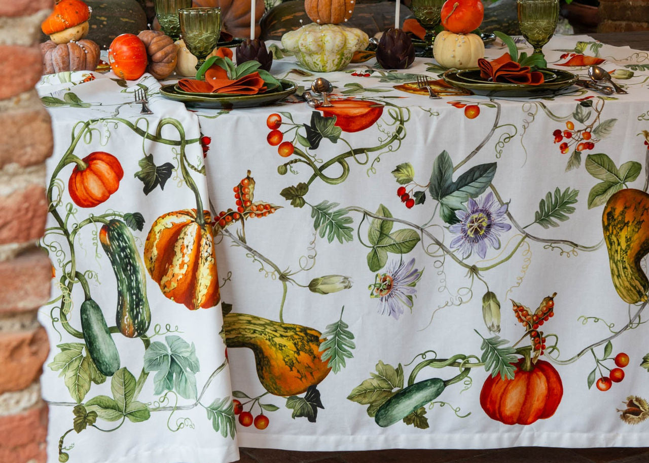 La tovaglia autunnale KURBIS ricorda i profumi della terra e i pranzi che si allungano al tepore di un raggio di sole. È un invito a raccogliere i doni della natura e a portarli in tavola. Perfetta per una cena rustica o per le occasioni festive, la tovaglia per halloween KURBIS sa di vendemmia, di zuppa fumante, di pane appena sfornato e di chiacchiere che restano sospese nell'aria.