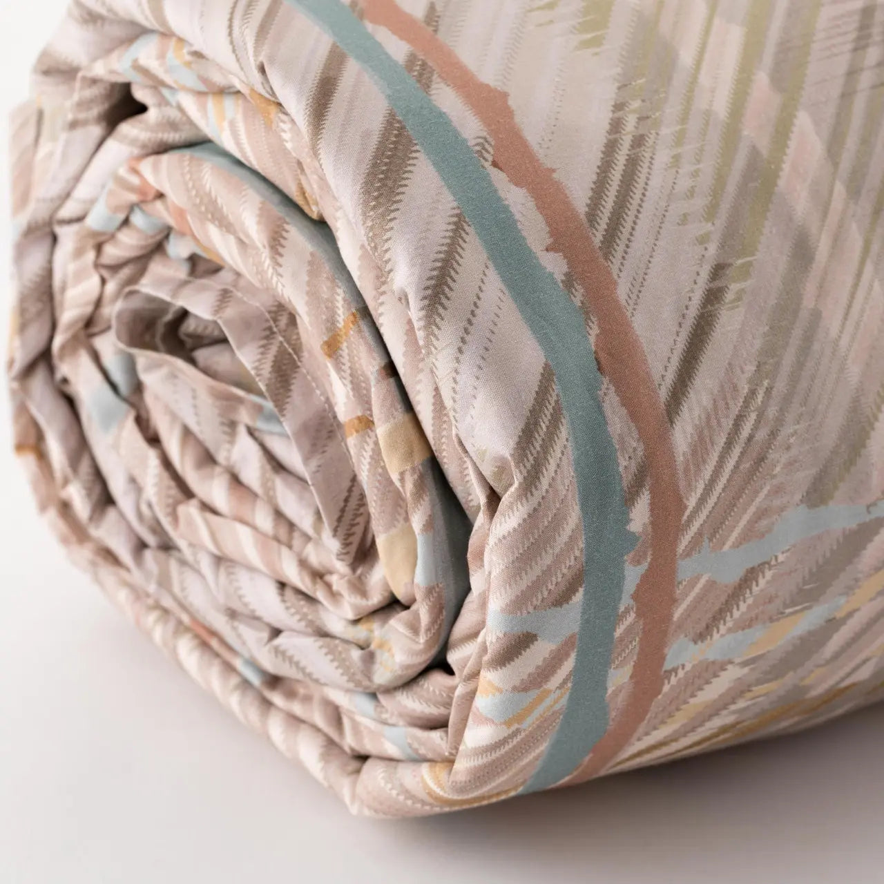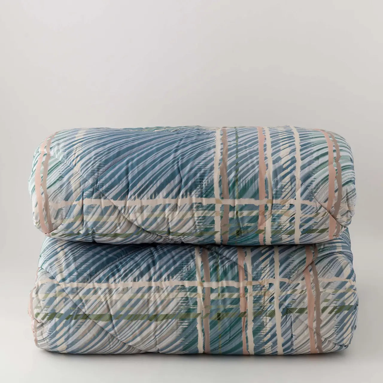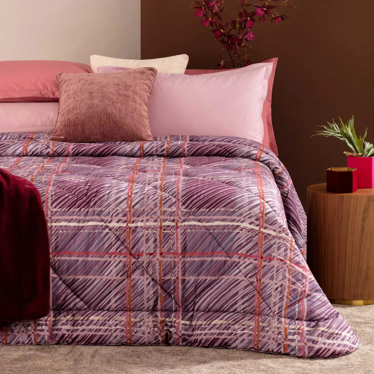 Con il suo disegno geometrico a rombi, la trapunta percalle Yuta si distingue per l’eleganza sottile di un tartan reinterpretato in chiave contemporanea. Le linee tratteggiate e i contrasti grafici donano al tessuto un dinamismo sofisticato, capace di trasformare ogni camera da letto in uno spazio accogliente e ricercato. La lavorazione con stampa digitale su percalle 100% cotone garantisce una resa cromatica nitida e durevole, mentre l’imbottitura da 350 GSM in poliestere assicura il giusto equilibrio tra calore e leggerezza.