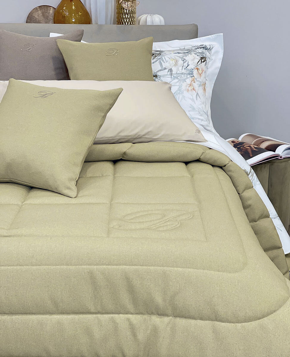 Trapunta matrimoniale in tessuto tinto in filo, logo B realizzato in trapuntatura.